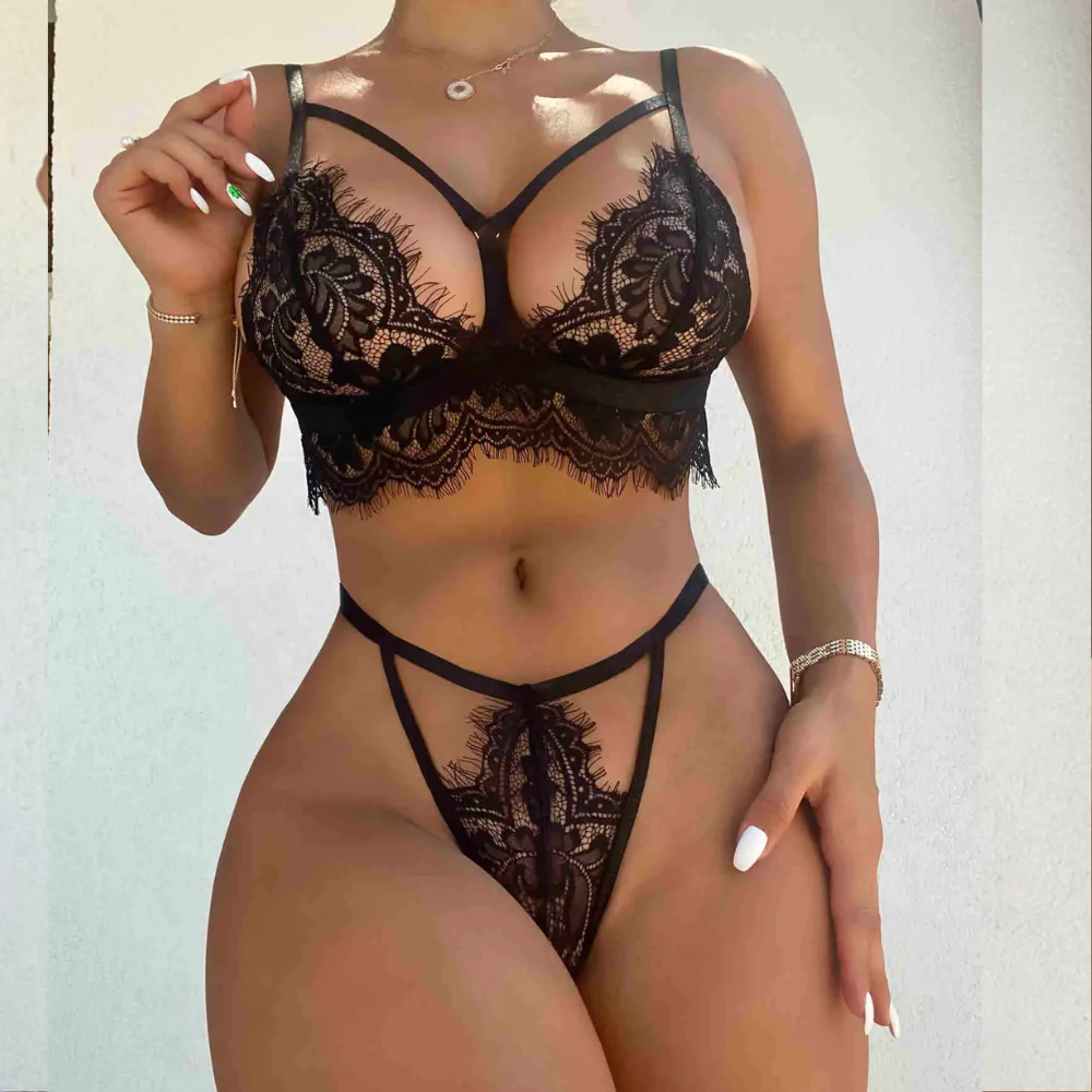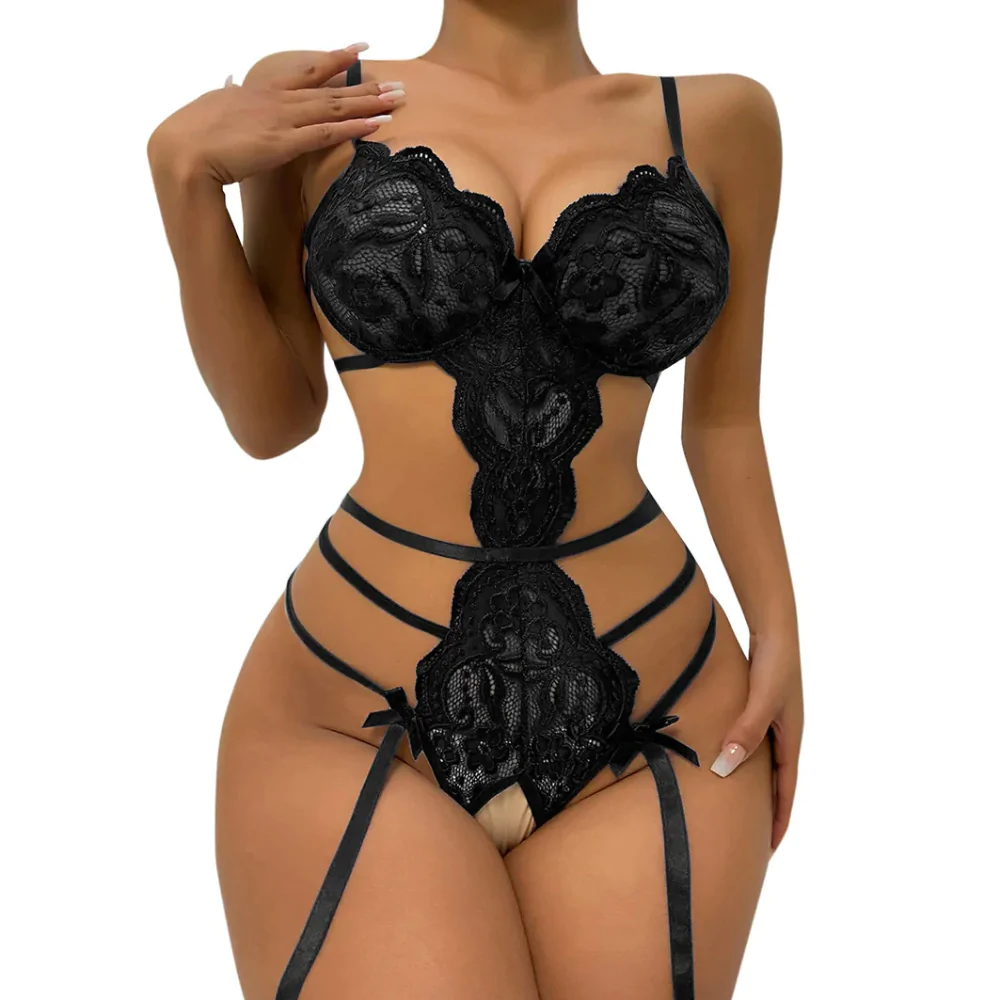 Sexy Black Lace Lingerie Set – Strappy Bodysuit for Women